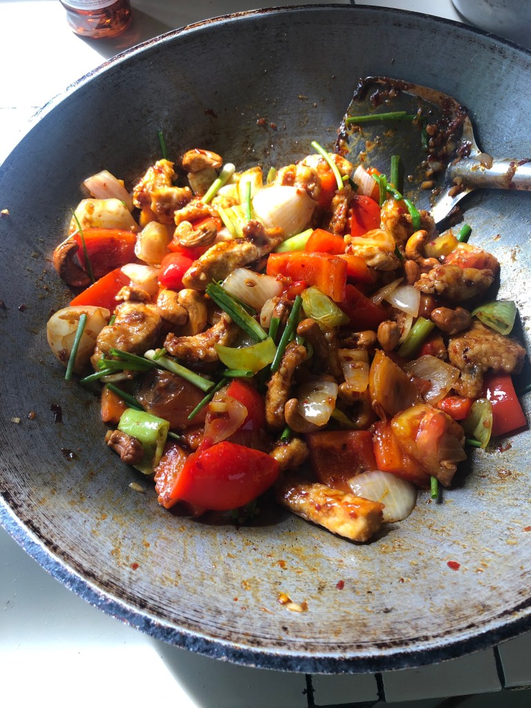 These pictures show me making the class Thai dish: Tom Yum Soup! The lime gives the dish the sour flavor and the spice comes from the chili peppers. The other ingredients are: lemongrass, kaffir lime leaves, and galangal. We added in oyster mushrooms and fresh fish. I also made chicken cashew nut! I also included a photo of my favorite store bought Thai chili paste brand from Mackro!