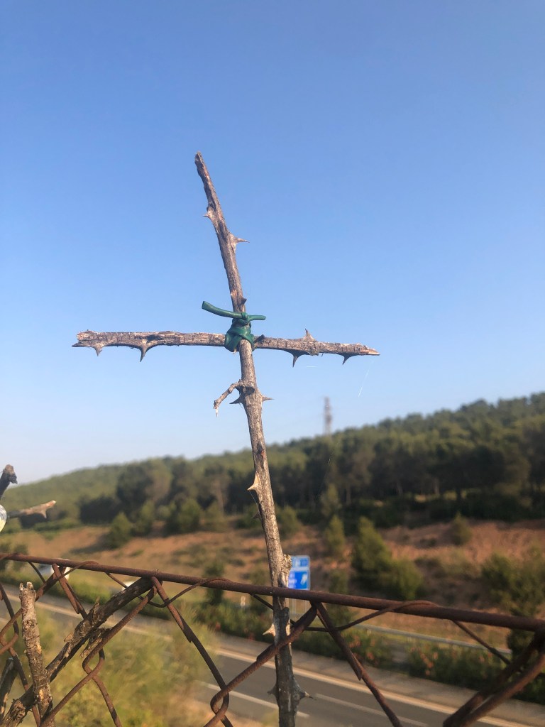We made wooden crosses and placed them on a wire fence above a highway. I said a prayer, and it was a lovely symbol of my intentions for this walk.
